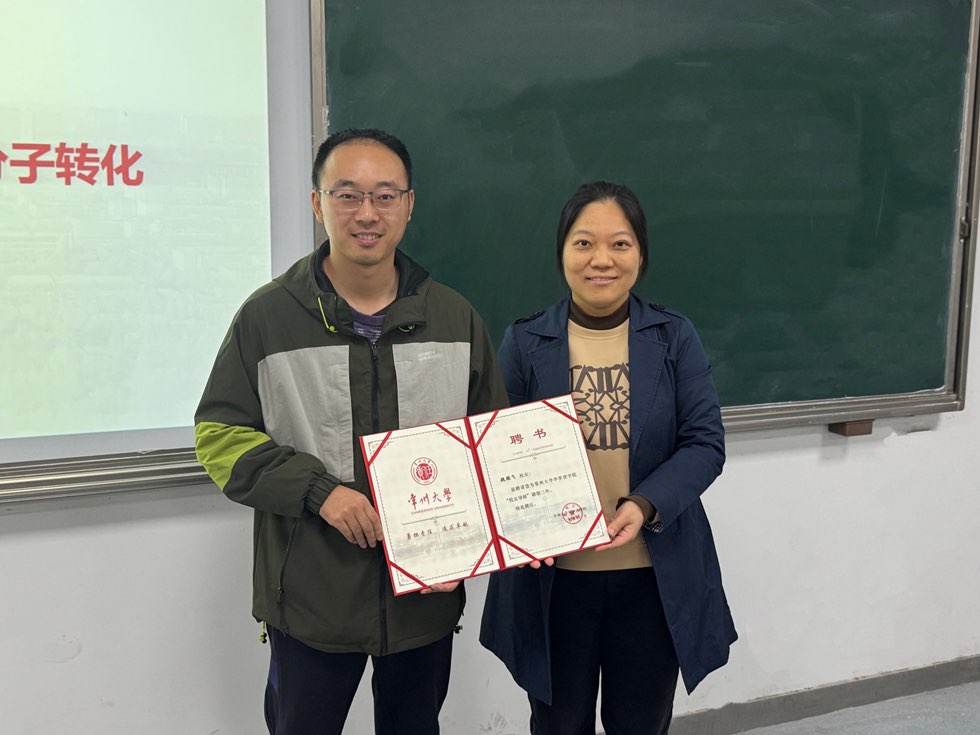 讲座开始前,动漫花园 党总支书记宣慧为魏鹏飞颁发“校友导师”聘书。