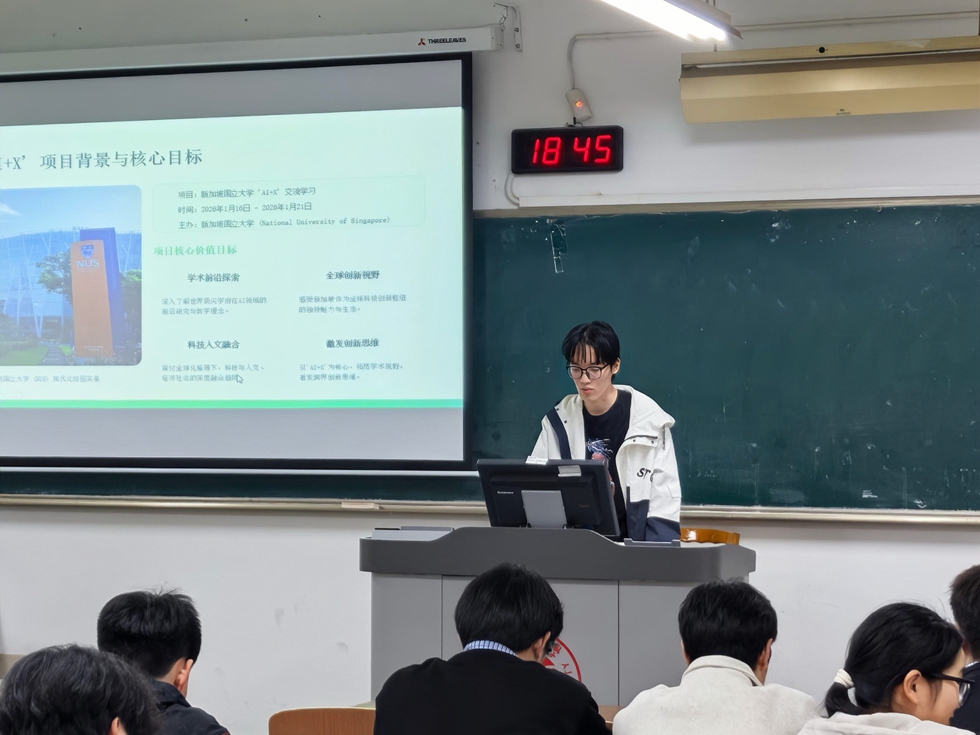 本次“AI+X”项目聚焦人工智能与机器人、全球贸易格局等前沿方向。分享会上,吴严昊谈到,通过短期研学,他对AI核心技术有了初步了解,认识到人工智能在机器人、贸易等领域的跨学科应用潜力,感受到前沿科技与实际场景结合的可能性。崔智杰则分享了行前准备、城市考察感悟及境外学习生活经历。他表示,新加坡在城市规划与科技创新方面的实践给他留下了深刻印象,跨文化交流也锻炼了沟通与协作能力,坦言此次研学收获很大、不虚此行。